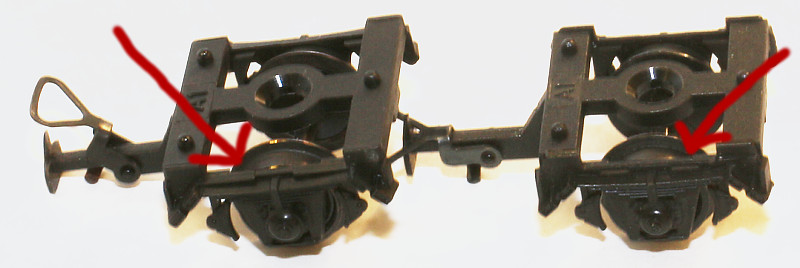 Am deutlichsten sind die Unterschiede ÜBER den Blattfedern zu erkennen (links Kleinbahn, rechts Klein Modellbahn):