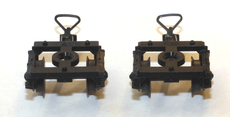Ganz erstaunt war ich, als ich 2 Achsgestelle „A1“, wie sie bei den kurzen Güterwagen verwendet werden, miteinander verglich – handelt es sich doch eindeutig um verschiedene Formen! (links: Kleinbahn, rechts: Klein Modellbahn)